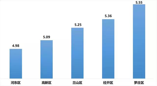 最好的是河东区(4.98),最差的是罗庄区(5.55)。